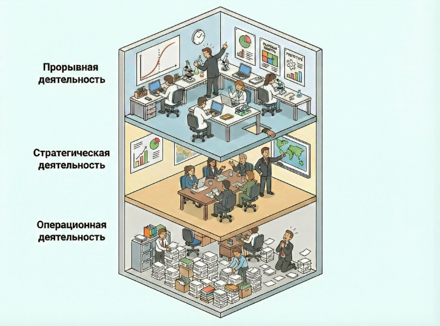- Прорывную (исследовательскую для выхода на новый виток S-образной кривой, разработки новой бизнес-модели).