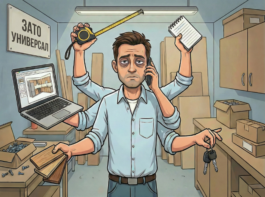 «Я работаю без выходных, с 7 утра до 23 вечера. Замеры, закупки, логистика, монтаж - всё на мне. У меня есть продавец, она делает дизайн-проекты, согласовывает замеры. Потом я подключаюсь - заказываю материалы, логистику, привожу всё сюда. Периодически происходят провалы в заказах, потому что я завален на других этапах»