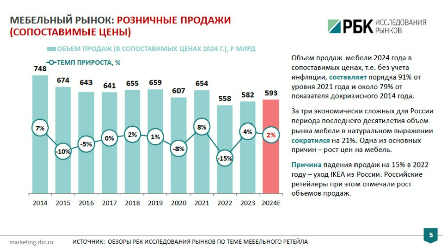Уход IKEA позволил подрасти ряду производителей и розничных игроков, но сам рынок от этого не стал шире — просто перераспределились доли.Рост денежной массы, конечно, облегчает жизнь, но, убрав инфляционный фактор, в целом видим стагнацию.